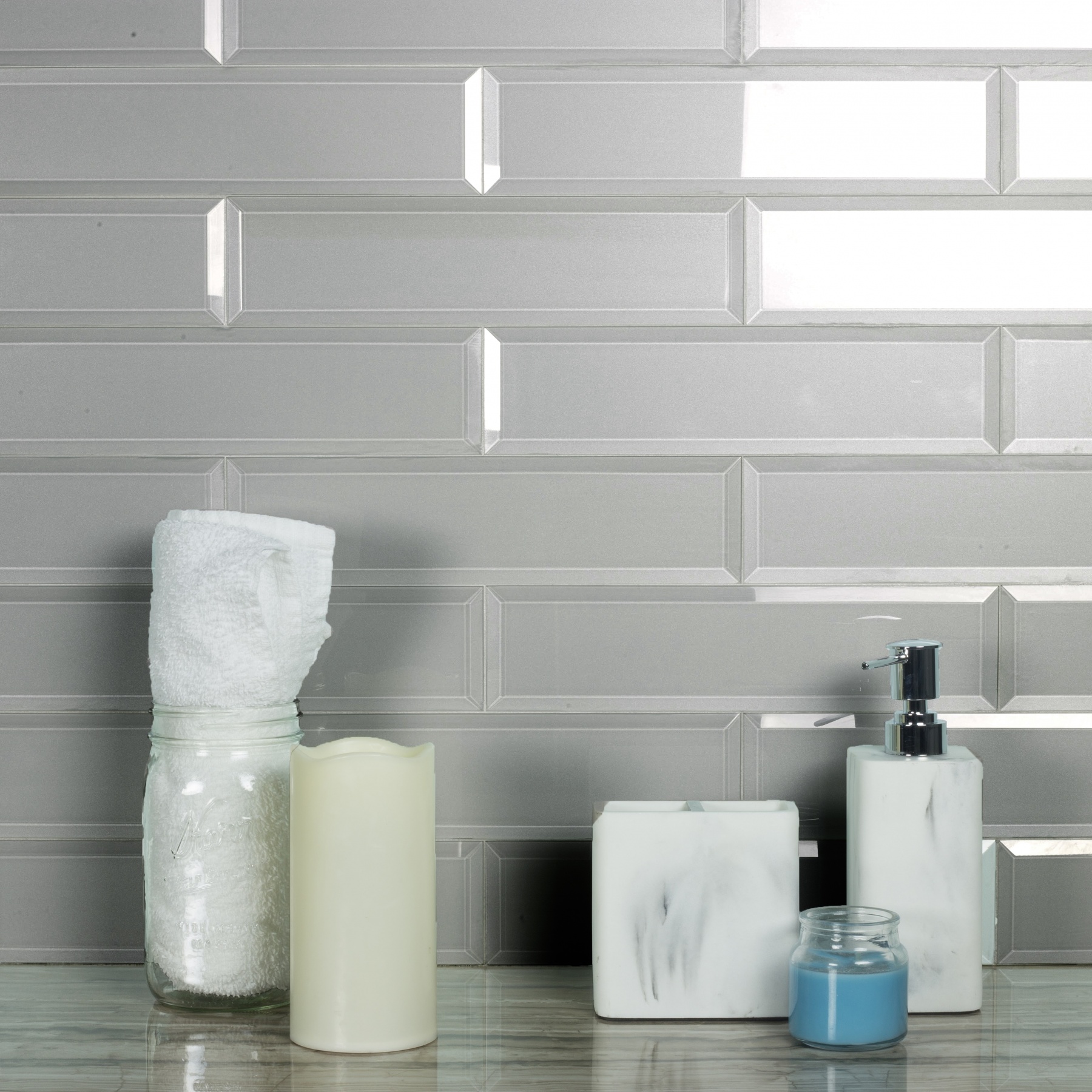 Reflections 3″ x 12″ Glass Mirror Beveled Subway Backsplash Wall Tile in Frosted Matte Silver