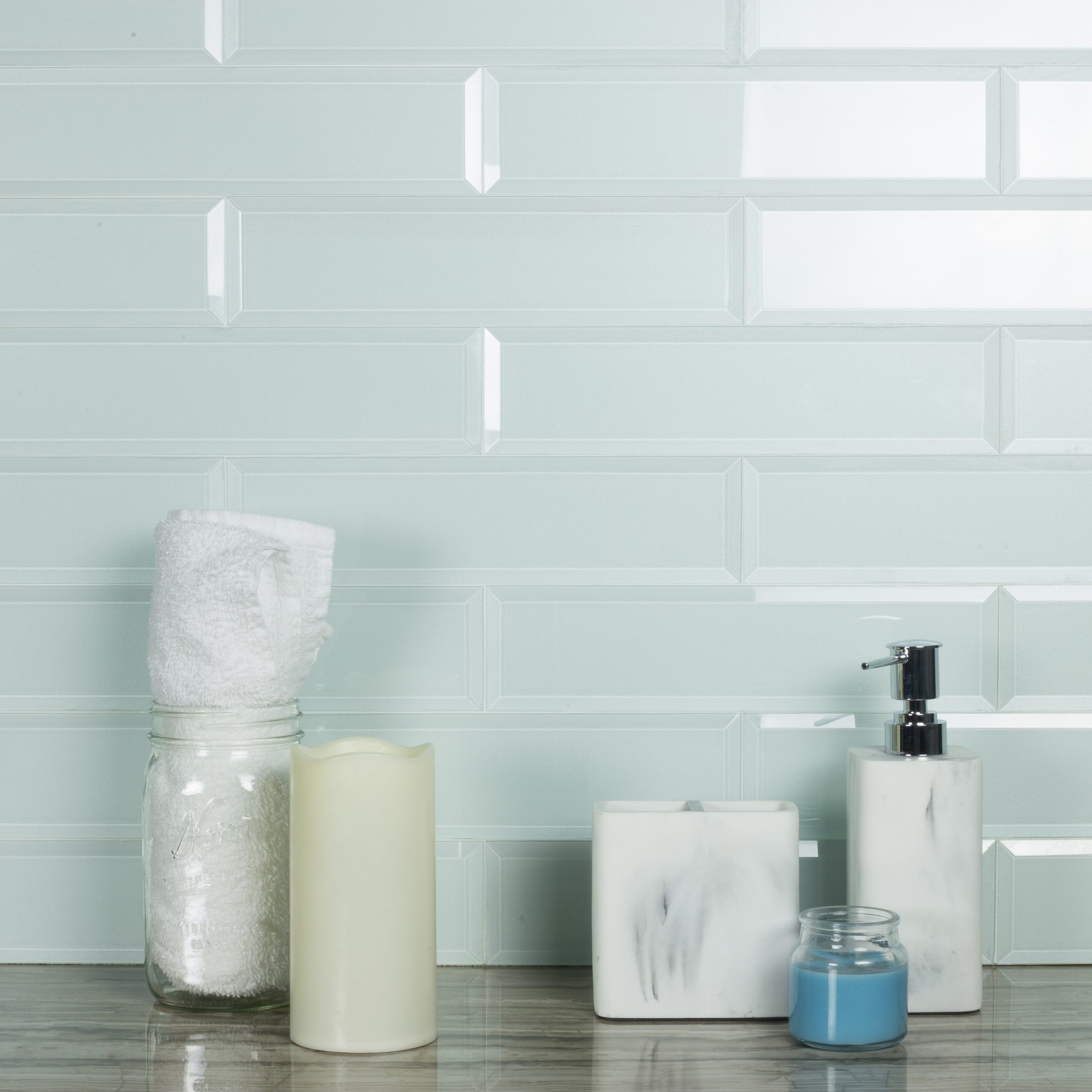 Frosted Elegance Peel & Stick 3″ X 12″ Glass Beveled Subway Backsplash Wall Tile in Glossy Light Blue