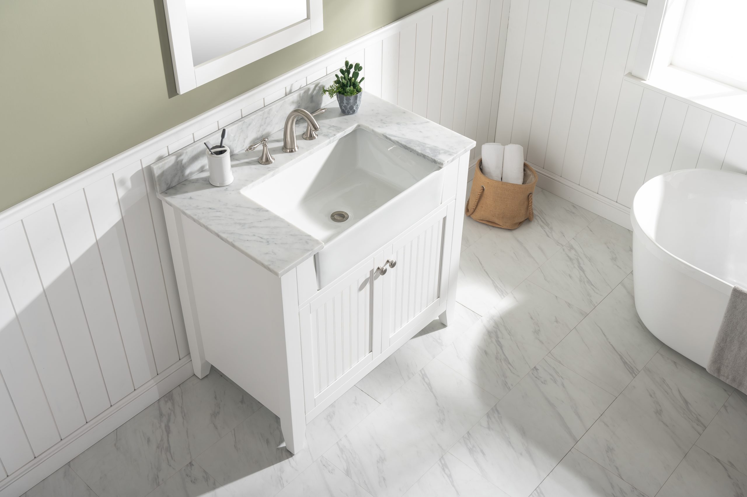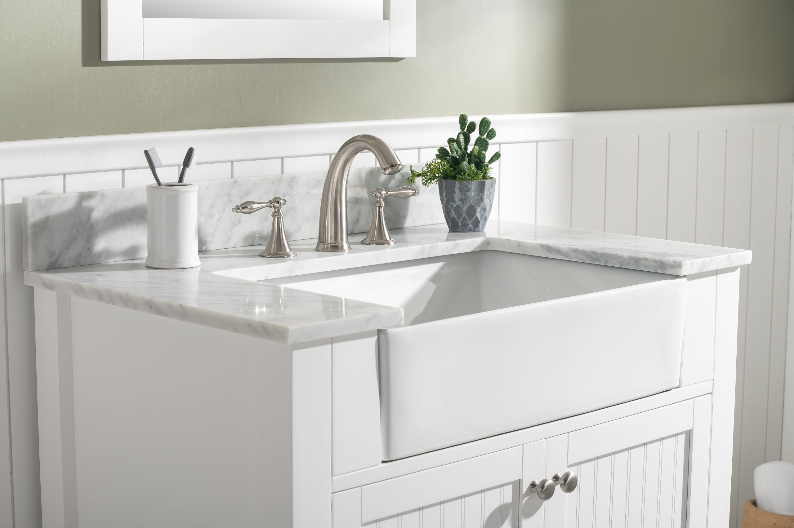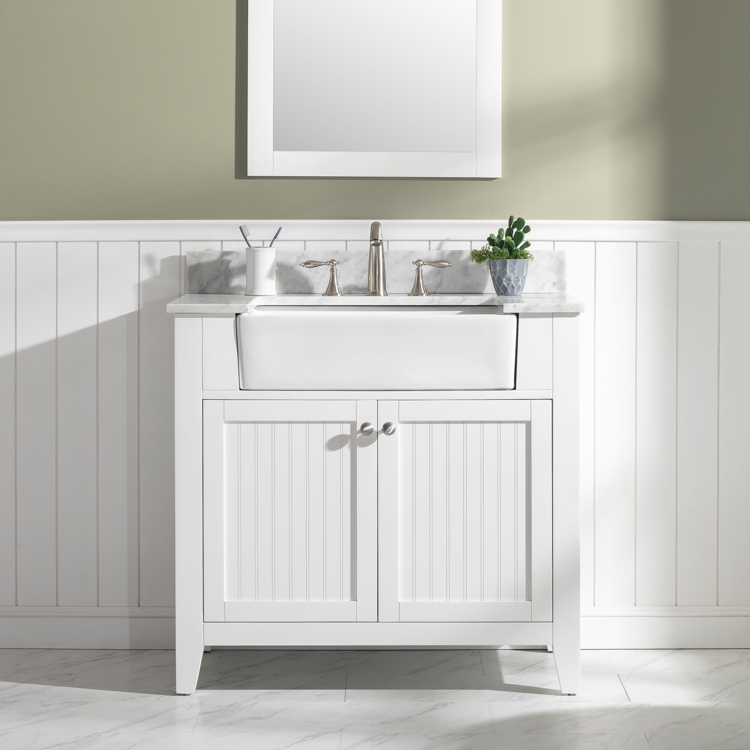 Combining classic farmhouse charms with modern features, the Burbank vanity collection by Design Element will instantly transform your bathroom into a beautiful retreat. All Burbank vanity cabinets are constructed from solid birch hardwood and paired with a 3/4 inch thick seamless Carrara white marble countertop and backsplash from Italy that is cut from a single slab. The extremely functional and generously sized ceramic farmhouse sink is the focal point of this vanity. Soft closing doors and drawers provide smooth and quiet operations, while brushed finished metal hardware provides the perfect finishing touch. Other fine details include dovetail joint drawer construction, predrilled holes to accommodate 8-inch widespread faucets, and multi-layer paint finish on the cabinets provide beauty and durability for years to come.