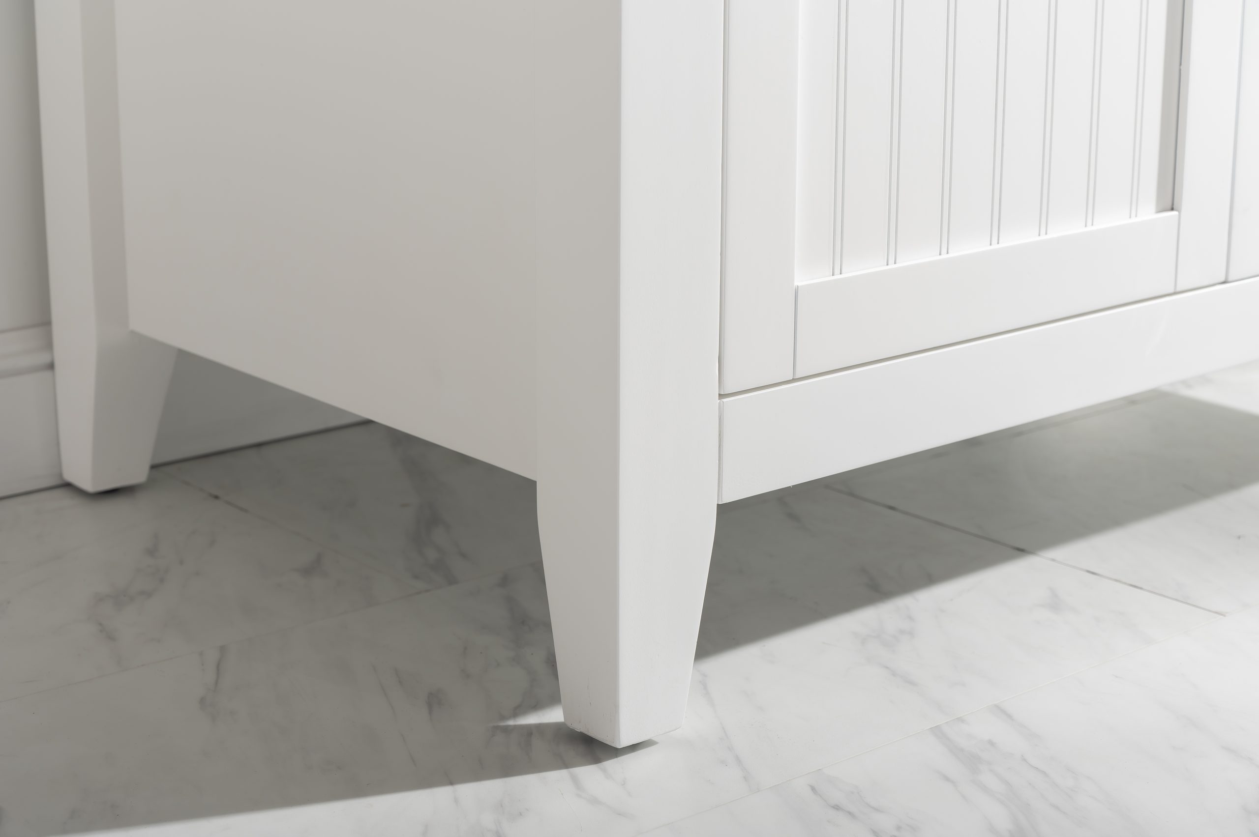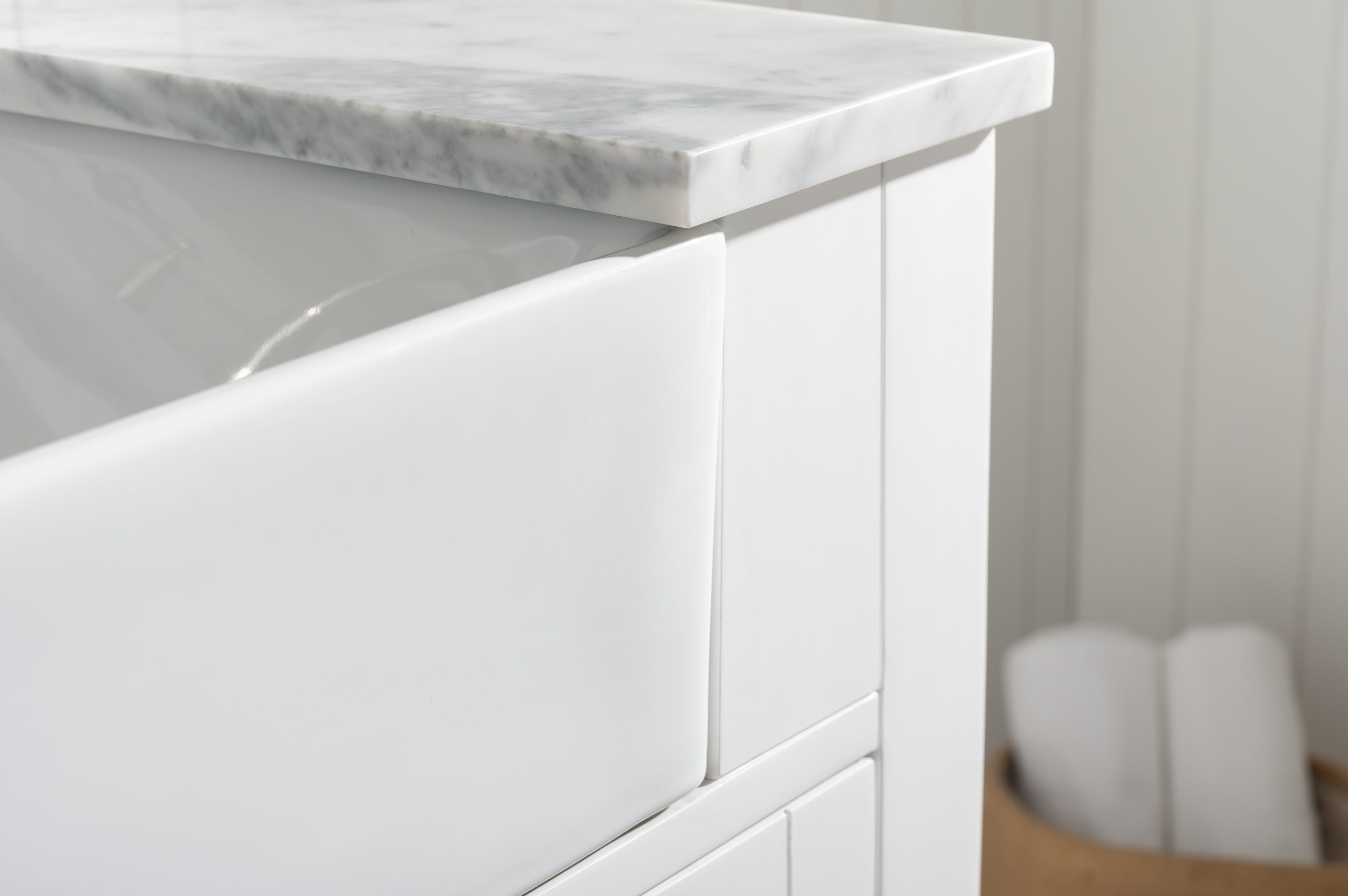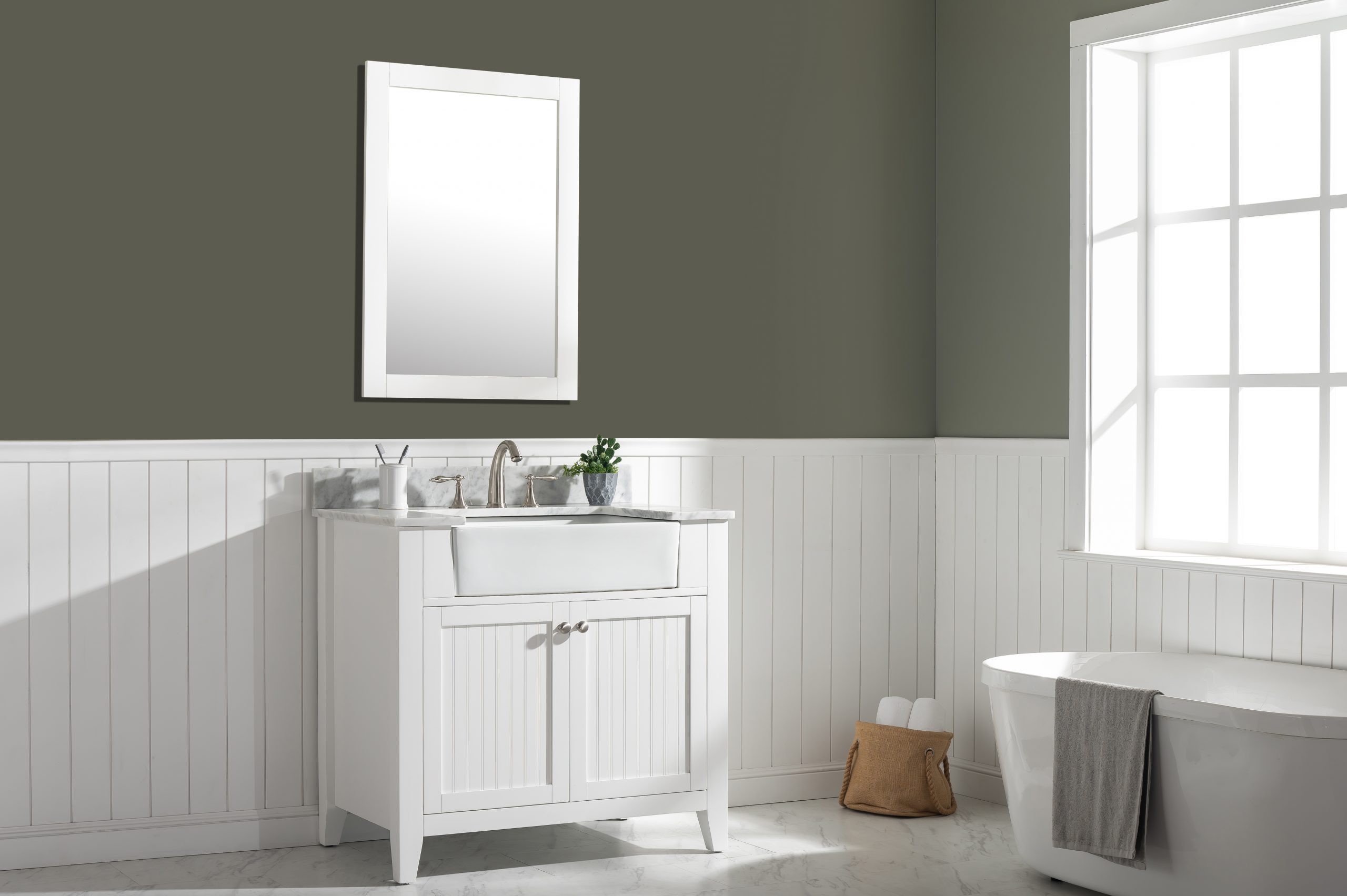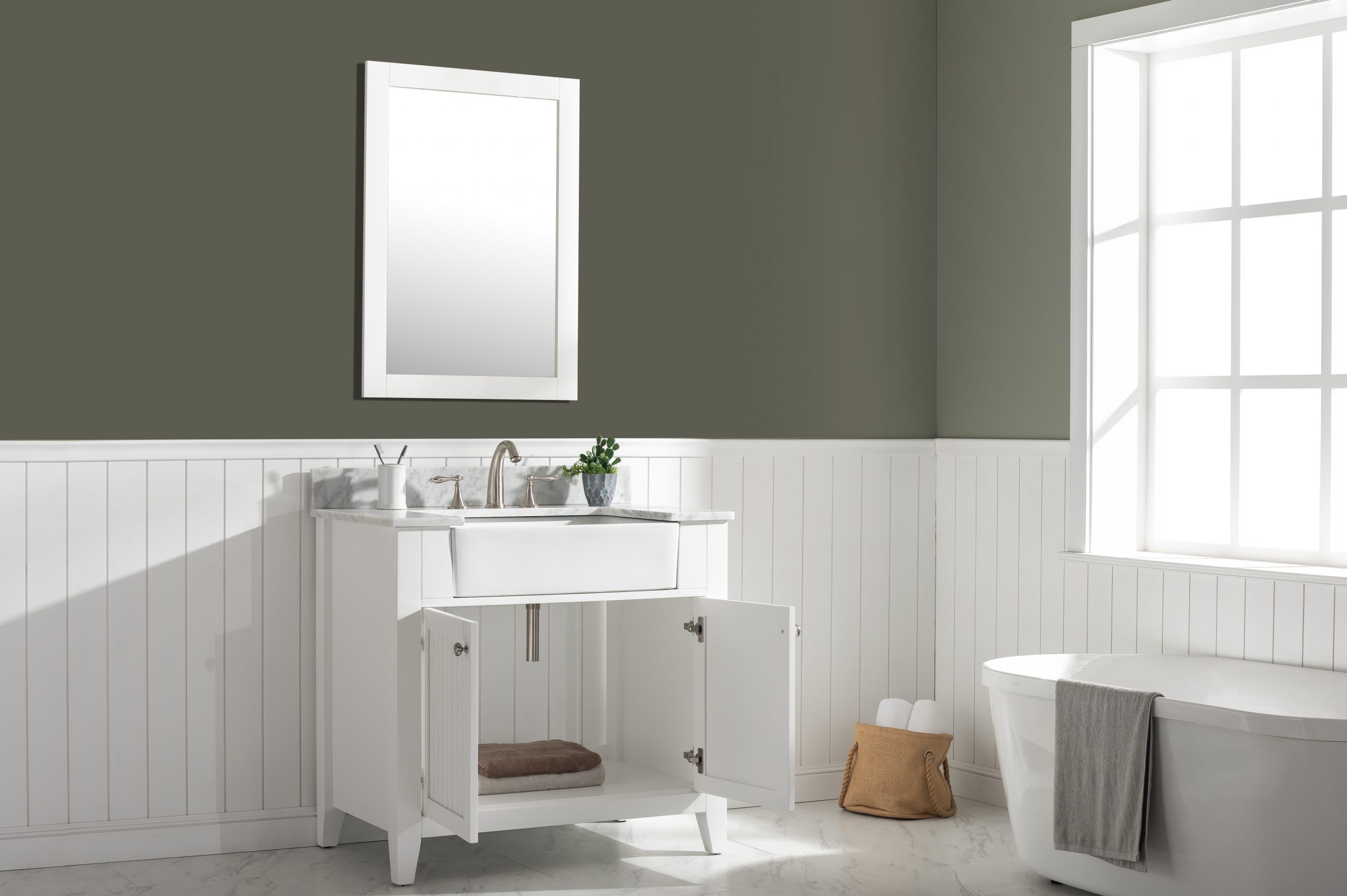 Combining classic farmhouse charms with modern features, the Burbank vanity collection by Design Element will instantly transform your bathroom into a beautiful retreat. All Burbank vanity cabinets are constructed from solid birch hardwood and paired with a 3/4 inch thick seamless Carrara white marble countertop and backsplash from Italy that is cut from a single slab. The extremely functional and generously sized ceramic farmhouse sink is the focal point of this vanity. Soft closing doors and drawers provide smooth and quiet operations, while brushed finished metal hardware provides the perfect finishing touch. Other fine details include dovetail joint drawer construction, predrilled holes to accommodate 8-inch widespread faucets, and multi-layer paint finish on the cabinets provide beauty and durability for years to come.