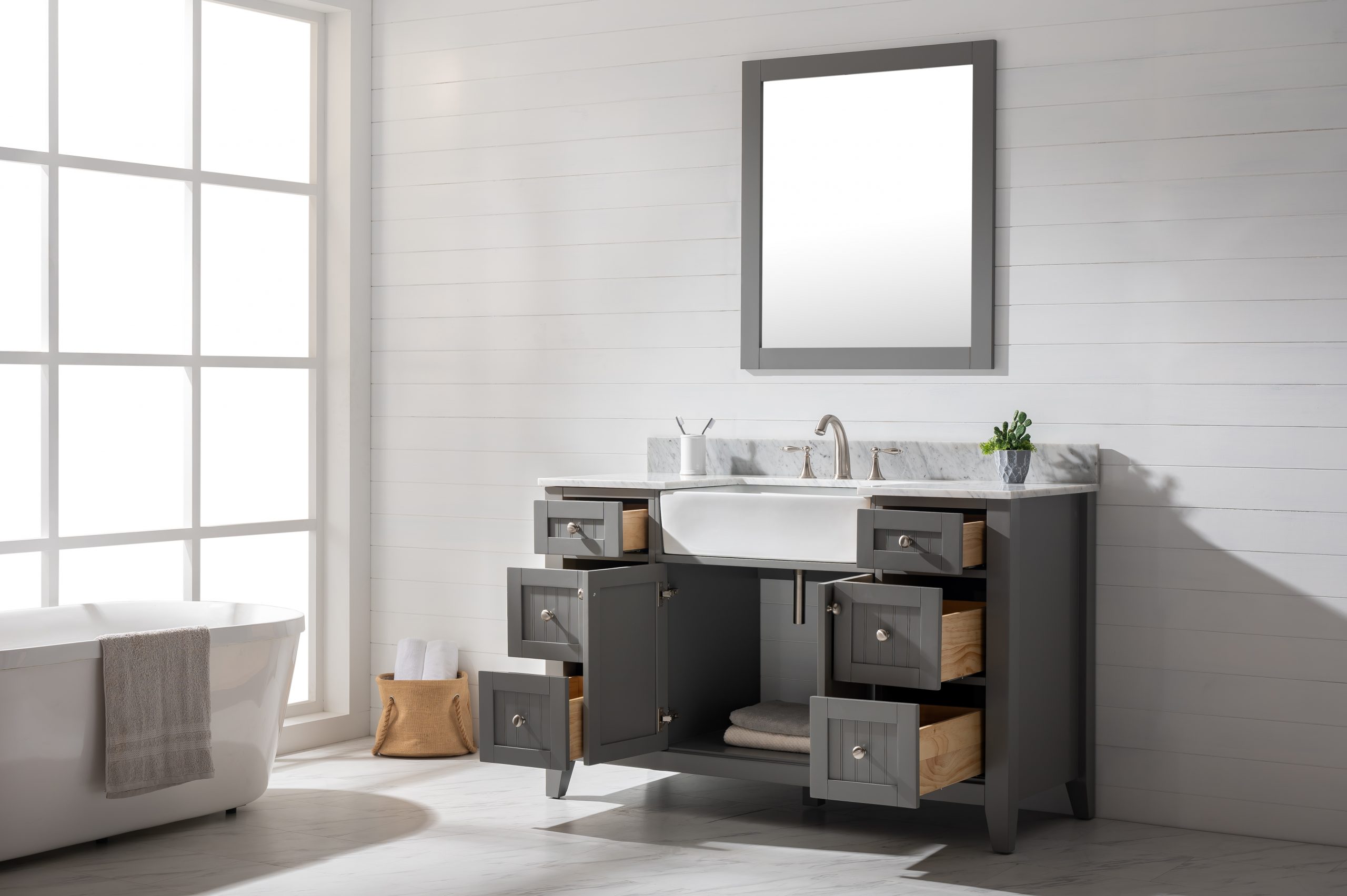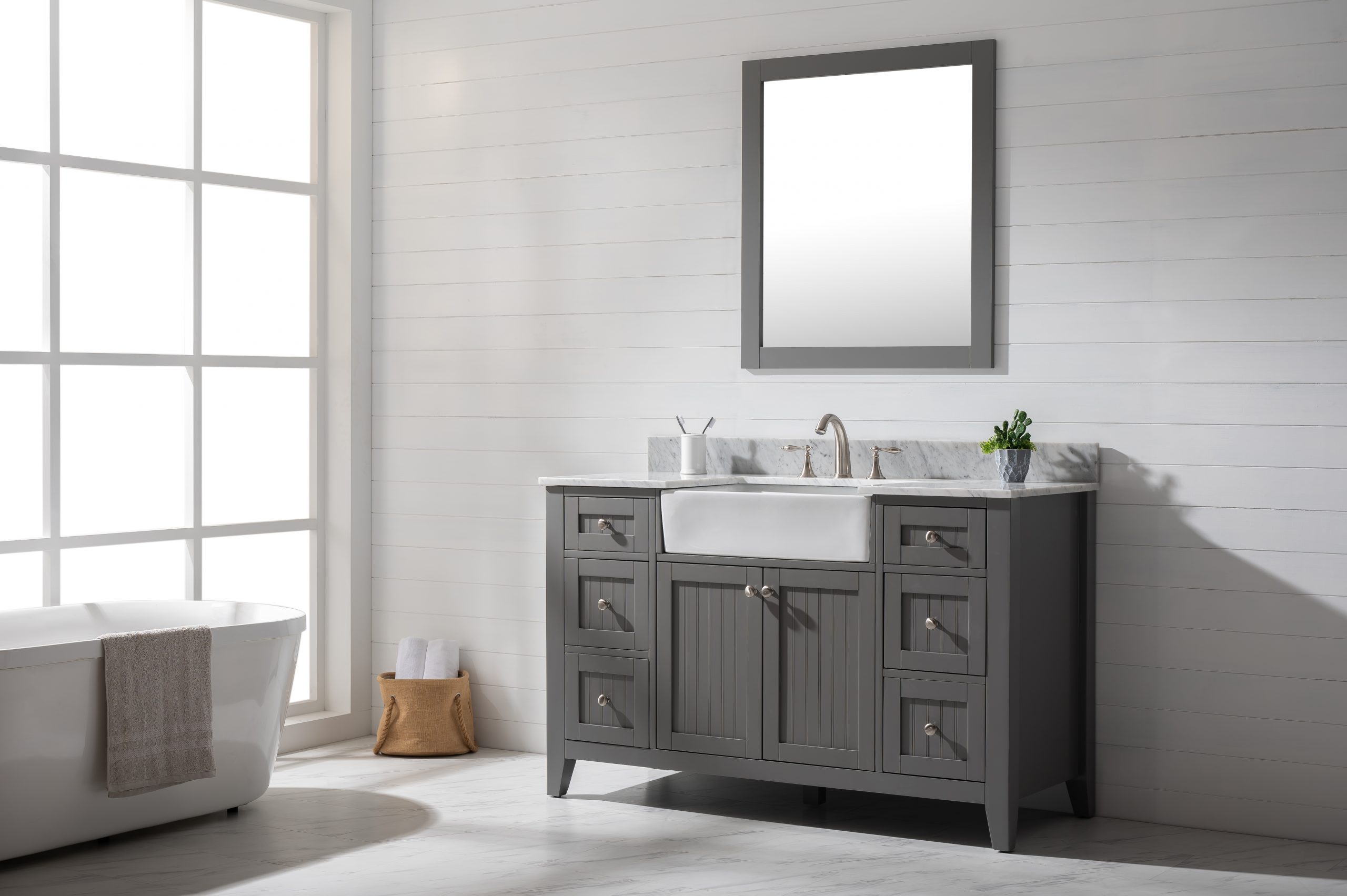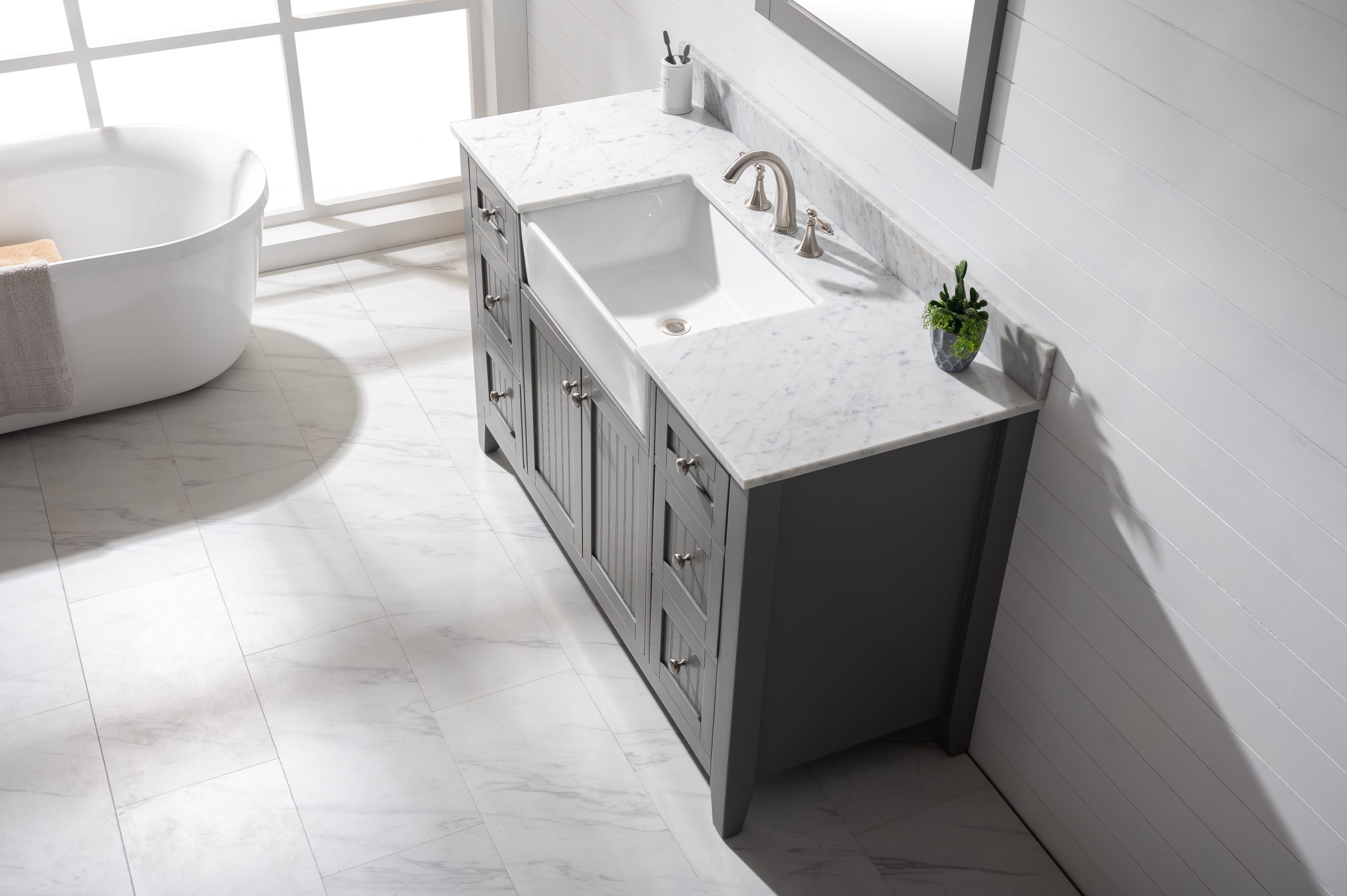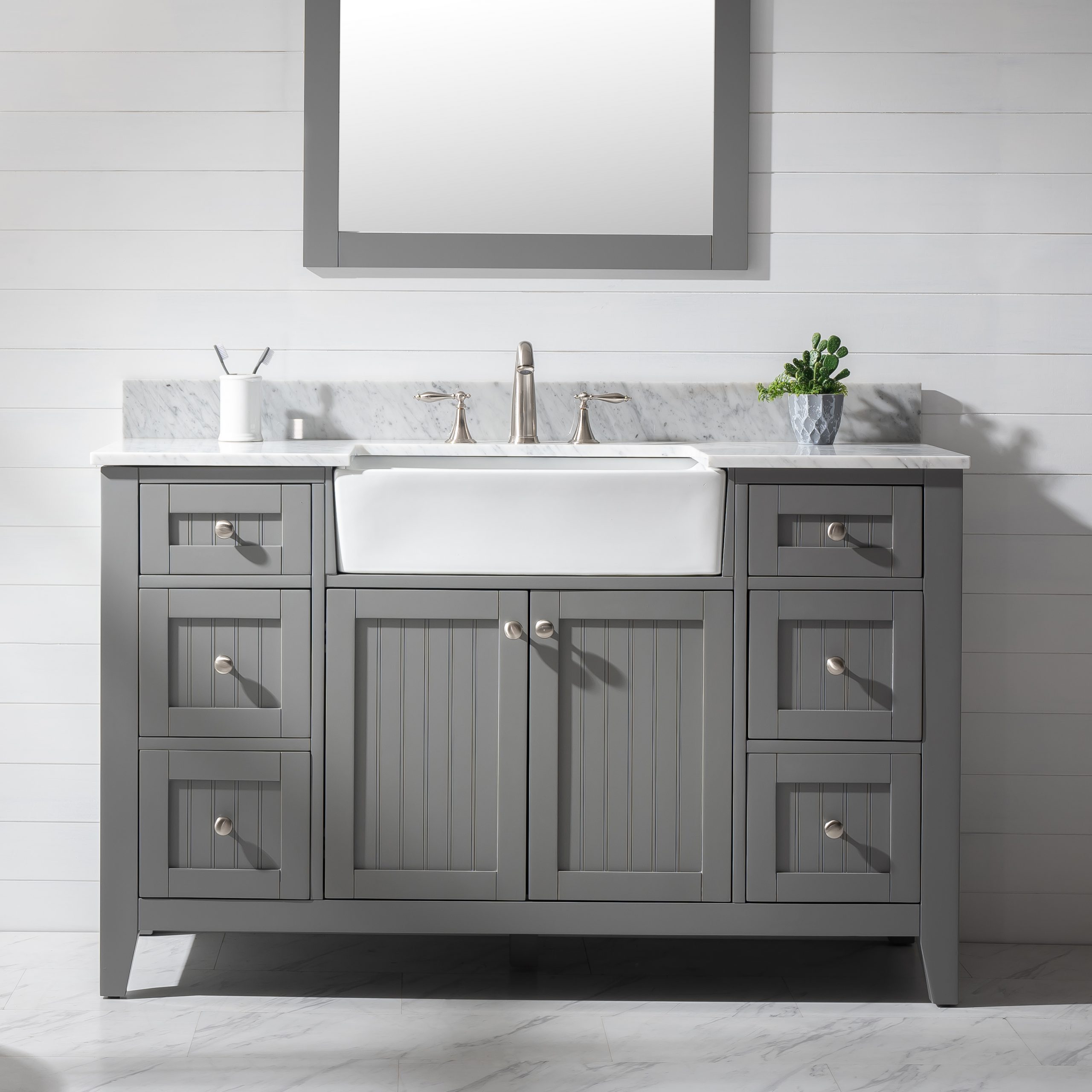 Combining classic farmhouse charms with modern features, the Burbank vanity collection by Design Element will instantly transform your bathroom into a beautiful retreat. All Burbank vanity cabinets are constructed from solid birch hardwood and paired with a 3/4 inch thick seamless Carrara white marble countertop and backsplash from Italy that is cut from a single slab. The extremely functional and generously sized ceramic farmhouse sink is the focal point of this vanity. Soft closing doors and drawers provide smooth and quiet operations, while brushed finished metal hardware provides the perfect finishing touch. Other fine details include dovetail joint drawer construction, predrilled holes to accommodate 8-inch widespread faucets, and multi-layer paint finish on the cabinets provide beauty and durability for years to come.