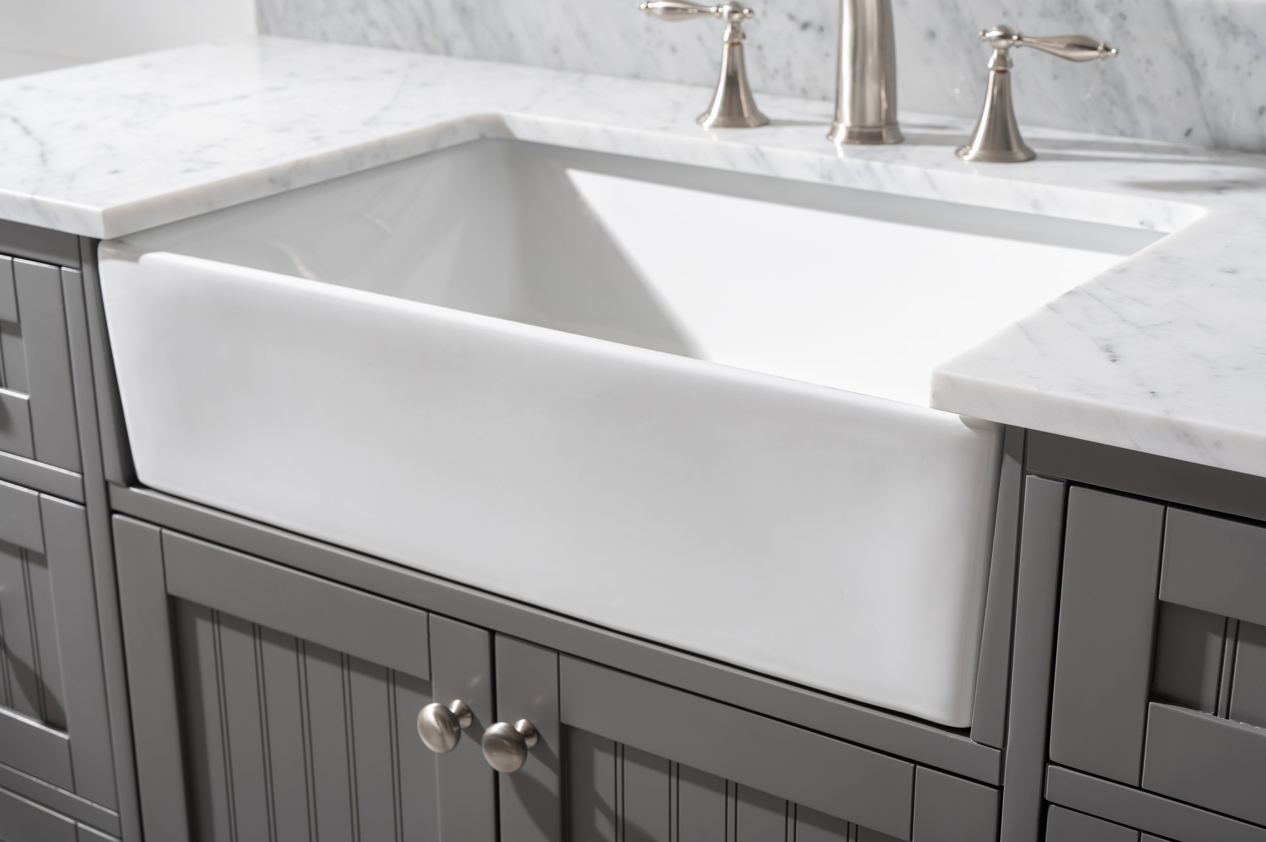 Metal hardware in brushed nickel finish.Large ceramic farmhouse sink