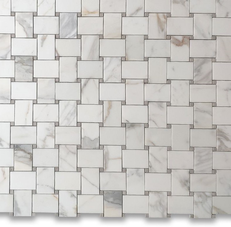 Calacatta Gold Basketweave with Calacatta Gold Dot Polished Mosaic is a premium choice for homeowners and designers looking for high-end marble mosaic tile. Size: Calacatta gold marble tile features an all white background with dramatic veins in gray and golden tones.. Featuring elegant natural stone detailing, this tile is ideal for kitchen backsplashes, bathroom walls, shower surrounds, and decorative accents. 12 x 12 (1.00 SF) Crafted for durability and timeless appeal, this luxury mosaic tile enhances both modern and classic interiors. Popular for wall and floor applications, it is one of the most searched marble mosaic tiles for upscale spaces.12 x 12 (1.00 SF)