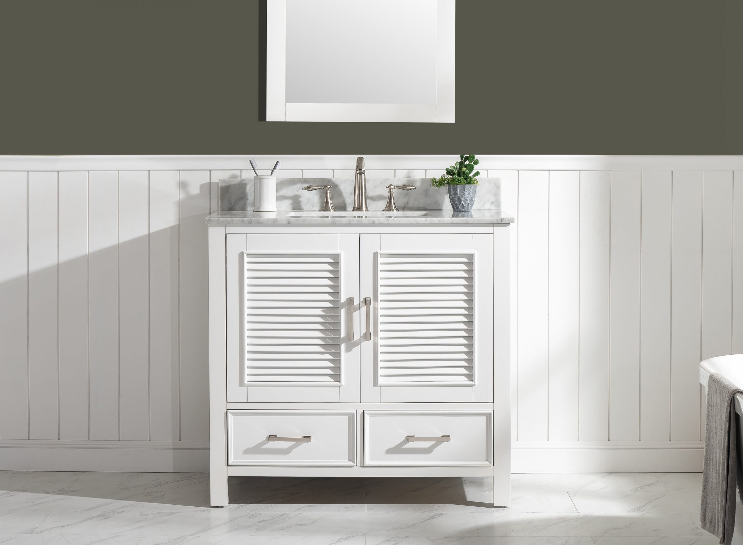 The Estate vanity collection by Design Element combines traditional charm with modern functionality into a beautiful statement piece for your bathroom. All Estate vanity cabinets are constructed from solid birch hardwood and paired with a 3/4 inch thick seamless Carrara white marble countertop and backsplash from Italy that is cut from a single slab. Soft closing doors and drawers provide smooth and quiet operations, while brushed finished metal hardware provides the perfect finishing touch. Other fine details include a white porcelain sink with overflow, dovetail joint drawer construction, predrilled holes to accommodate 8-inch widespread faucets, and multi-layer paint finish on the cabinets provide beauty and durability for years to come.