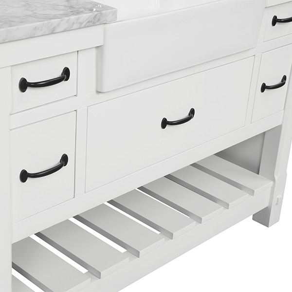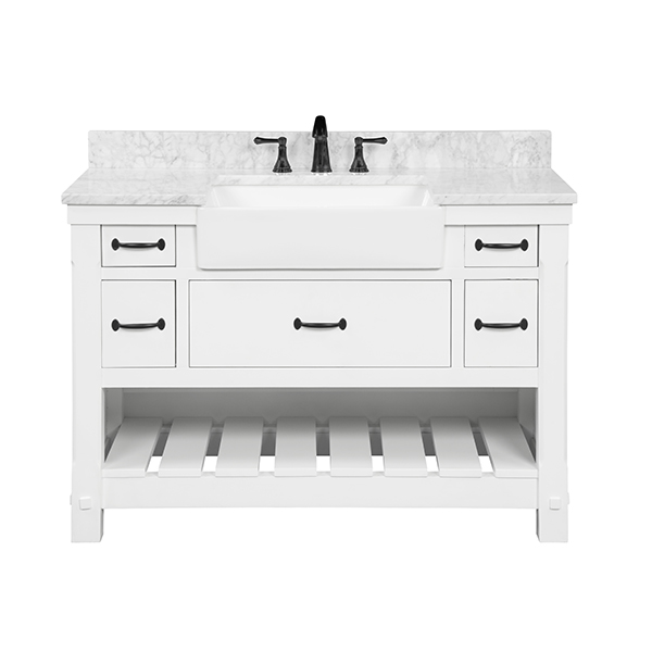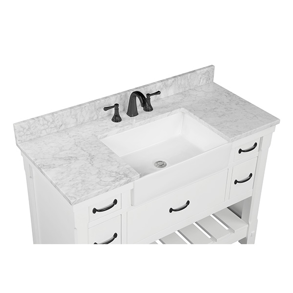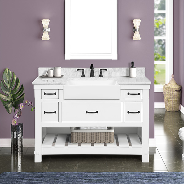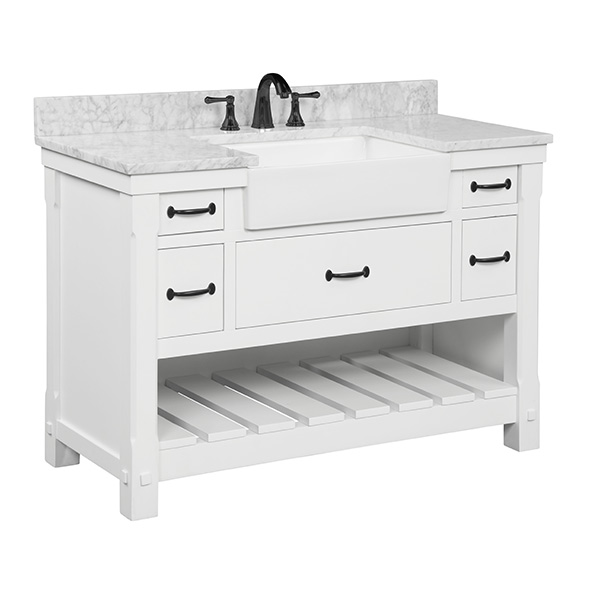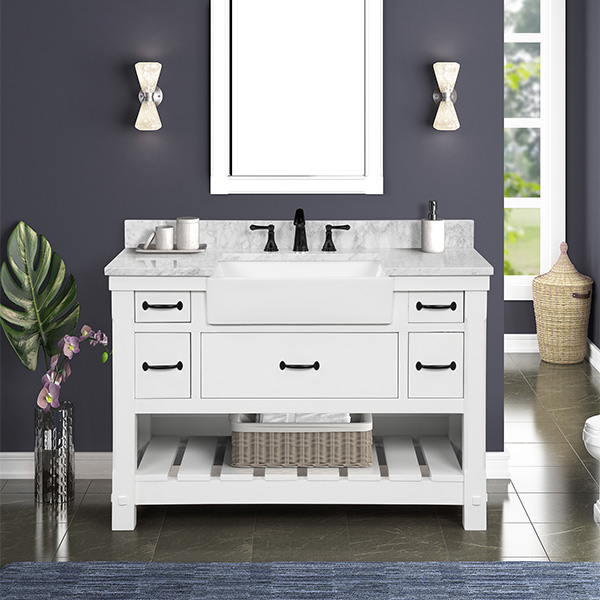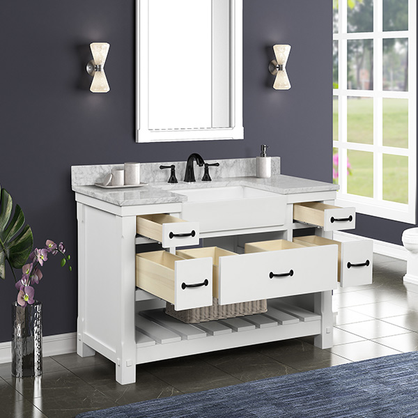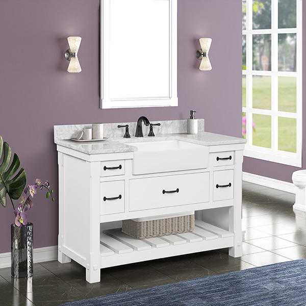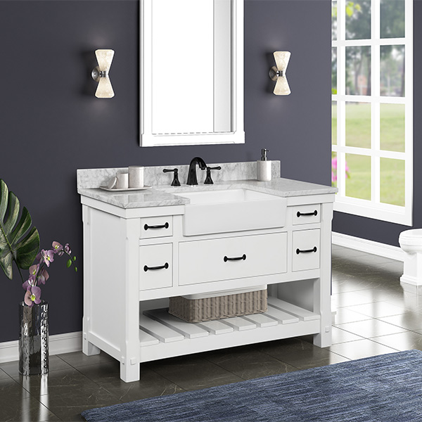 Farmington Dove White Vanity 49″W x 22″ D x 34.5″ H •Furniture style with solid wood structure and fully assembled