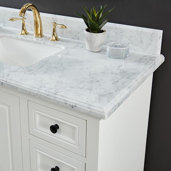 •1″ thick solid Italian Carrara White Marble Top with 4″ back splash and rectangular China undermount sink