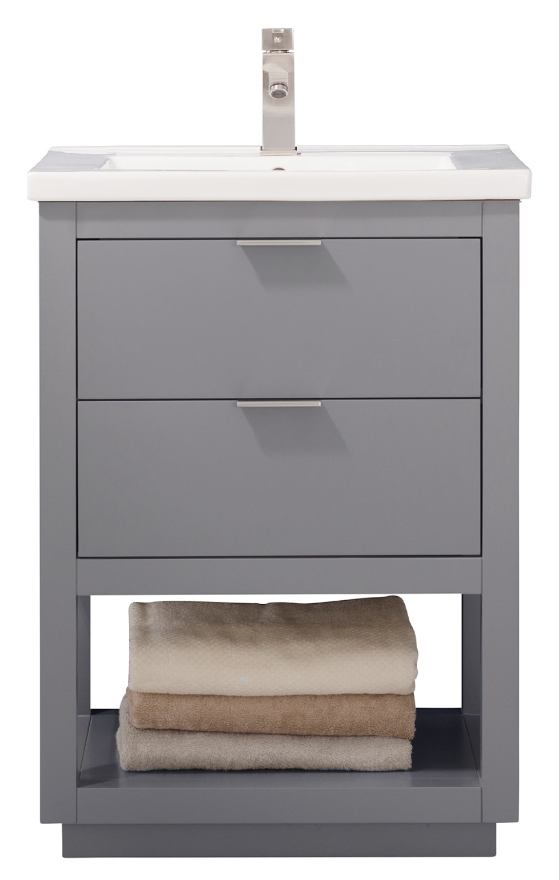 The Klein 24” Single Sink Vanity by Design Element provides the perfect finishing touch to your bathroom remodel project. Constructed of solid hardwood structure with manufactured wood panels this vanity will maintain its beauty and functionality year after year. The porcelain countertop and integrated sink with overflow perfectly match the styling of the cabinet and are extremely simple to maintain. There is ample storage space for this vanity despite its small size. Hidden in the flip-down drawer is a unique and useful storage box and a second fully functional drawer constructed with dovetail joinery sits on soft-close glides. There is also an open shelf at the base of the cabinet. The included Satin nickel hardware provides the perfect finishing touch to the gray cabinet. The faucet and drain are not included.