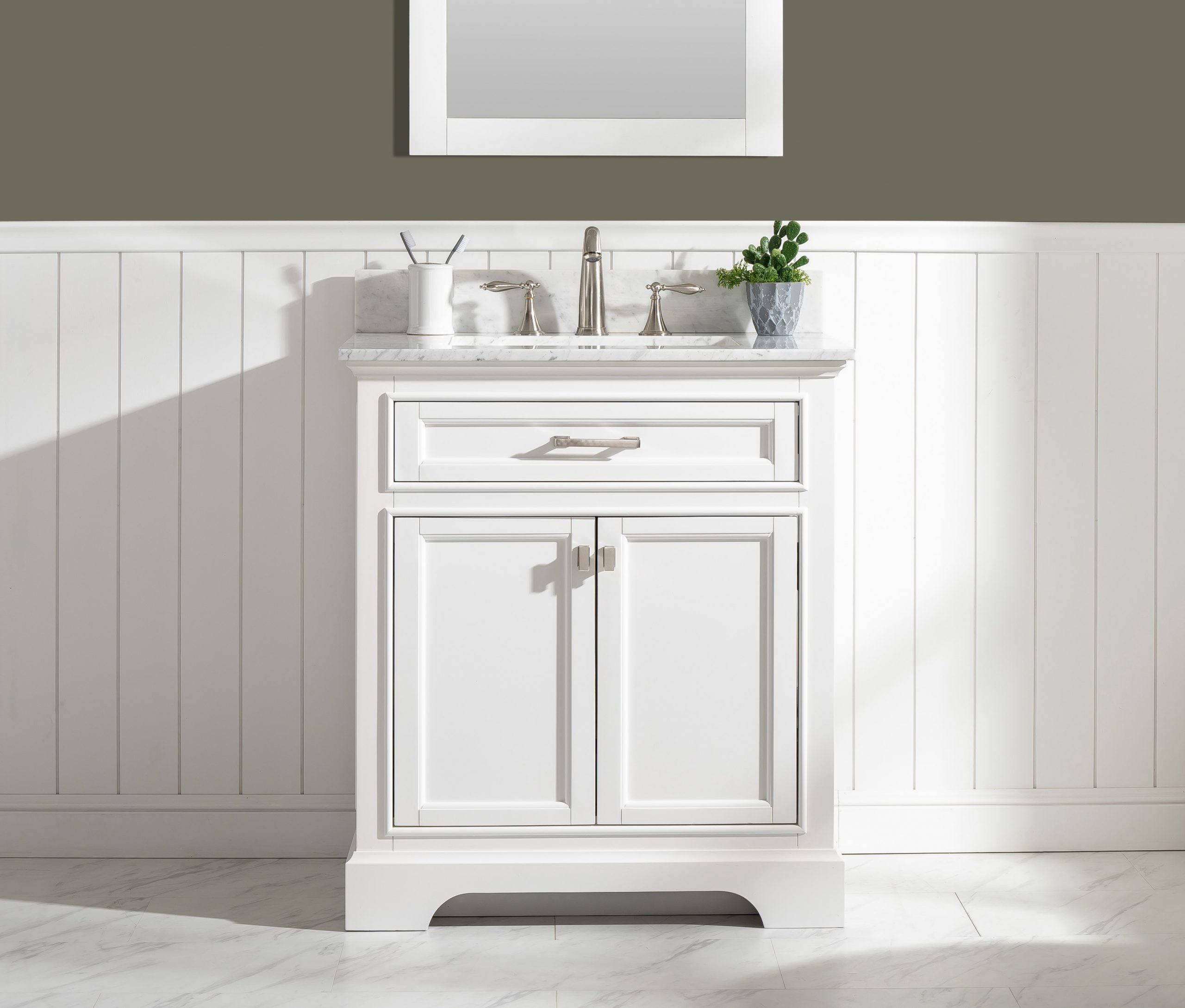 Combining classic charms with modern features, the elegant Milano vanity collection by Design Element will instantly transform your bathroom into a work of art. All Milano vanity cabinets are constructed from solid birch hardwood and paired with a 3/4 inch thick seamless Carrara white marble countertop and backsplash from Italy that is cut from a single slab. Soft closing doors and drawers provide smooth and quiet operations, while brushed finished metal hardware provides the perfect finishing touch. Other fine details include white porcelain sinks with overflow, dovetail joint drawer construction, predrilled holes to accommodate 8-inch widespread faucets, and multi-layer paint finish on the cabinets provide beauty and durability for years to come.