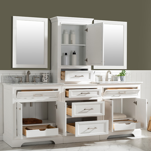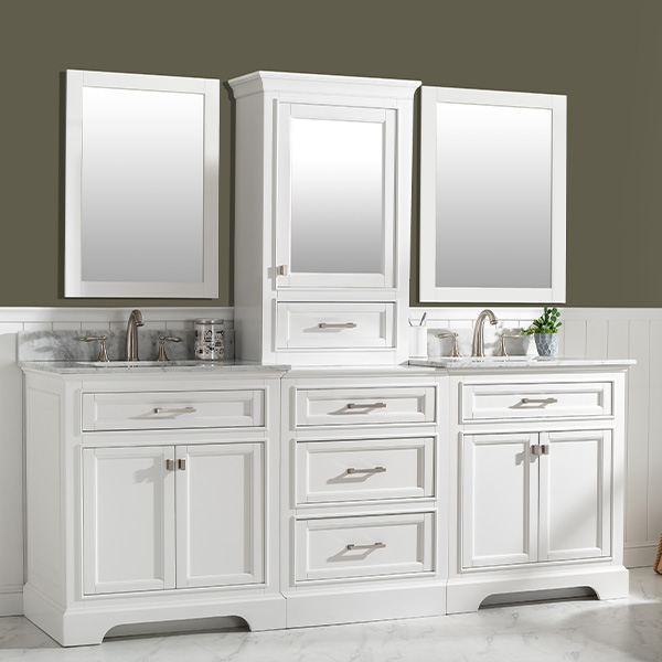 Multi-layer Paint Finished Vanity Cabinets Constructed from Solid Birch Hardwood and Manufactured Wood Panels 1″ thick quartz countertop with pre-drilled holes to accommodate 8″ widespread faucets