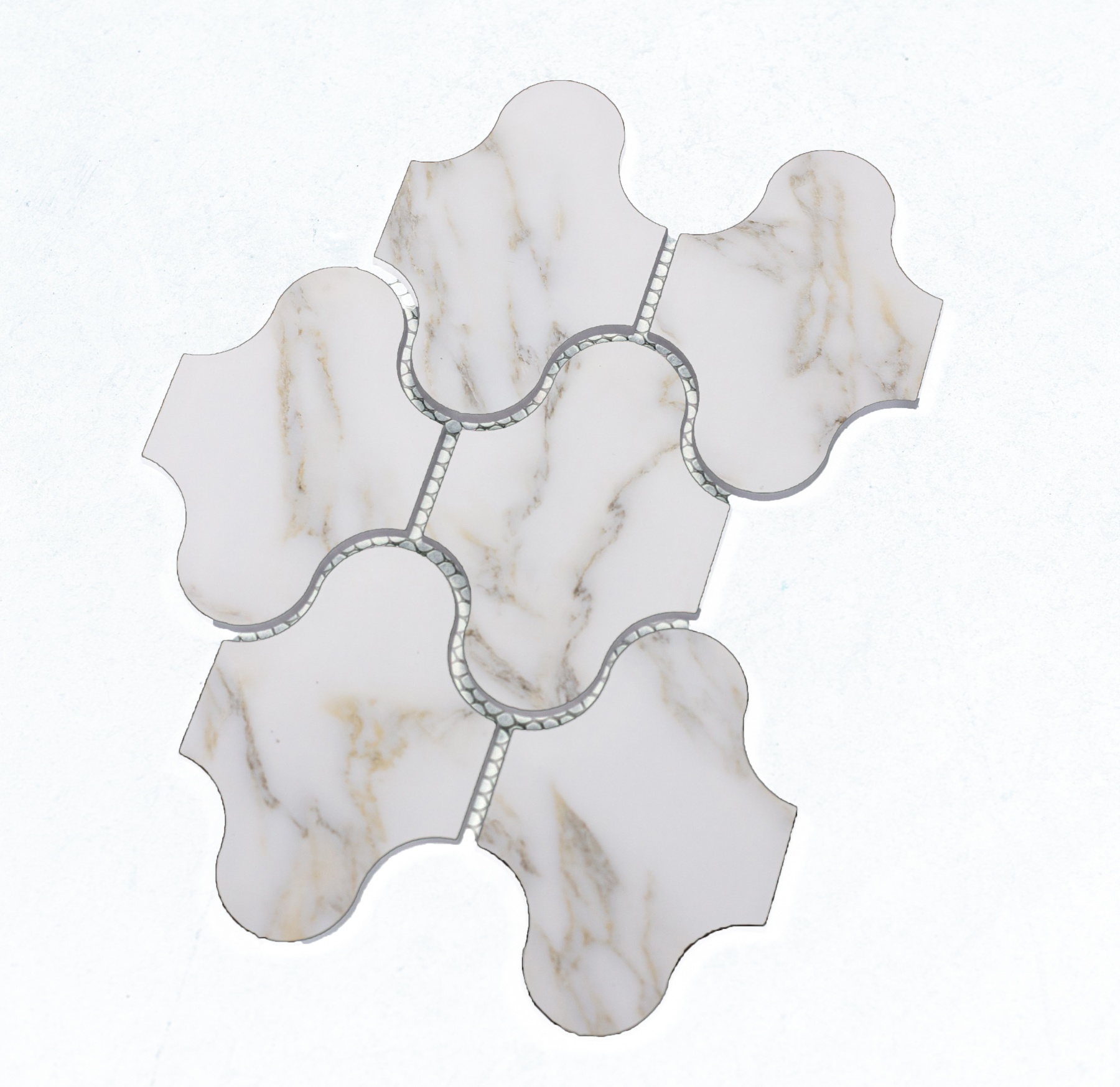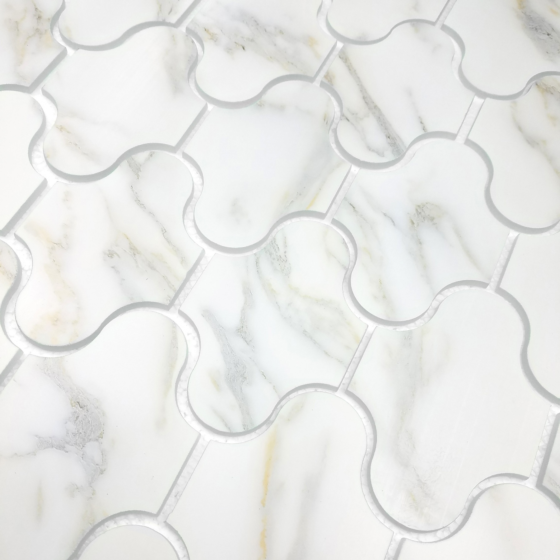 Nature 3.5X5.125 Matte Gold Glass Tile is a premium choice for homeowners and designers looking for high-end marble mosaic tile. Size: Nature 3.5 X 5.125 Matte Glass Swag Waterjet Backsplash Mosaic Wall Tile in Calacatta Gold. The Nature Collection is a twist on a traditional classic tile. Now you can bring the essence of the nature indoors with this decorative tiles. Get the feeling of the outdoors from the comfort of your own home. Installation Instructions: Install with Instaset Instant Adhesive Mastic (WHSPSA-ROLL) or Standard Install